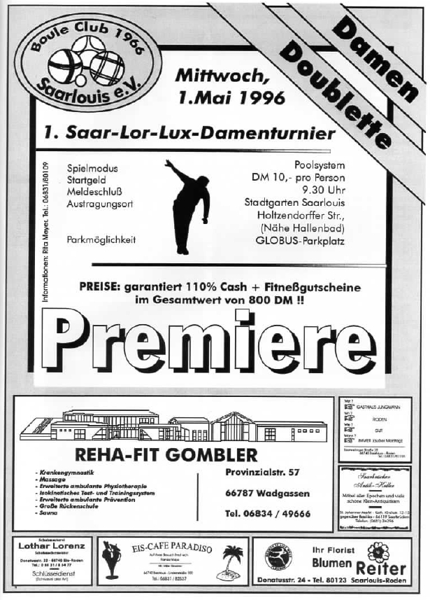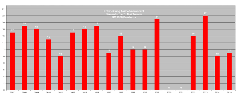 1996 – Die Geburt des Saar-Lor-Lux DamenturniersZum 30 jährigen Jubiläum setzte das Turnierjahr 1996 einen besonderen Akzent: Erstmals wurde neben dem Internationalen Bouleturnier am 1. Mai ein eigenständiges Damenturnier ausgetragen. Der BC Saarlouis übernahm dabei erneut eine Vorreiterrolle und richtete das erste reine Damenturnier im Saarland aus – ein Meilenstein für den Frauenboulesport der Region.Schon bei seiner Premiere verzeichnete das Turnier eine beeindruckend starke Beteiligung. Was als mutiger Schritt begann, entwickelte sich rasch zu einem festen Bestandteil der saarländischen Turnierlandschaft. Heute gehört das Saar-Lor-Lux Damenturnier ebenso selbstverständlich zum Kalender des Saarländischen Bouleverbands wie das traditionelle Hauptturnier am 1. Mai.SpielmodusZunächst werden fünf Runden frei ausgelost gespielt. Anschließend erfolgt die Einteilung gemäß der aktuellen Tabellenplatzierung. Die bestplatzierten Teams qualifizieren sich für das Halbfinale, dessen Sieger schließlich im Finale um den Turniersieg antreten.TeilnehmerentwicklungÜber die Jahre hinweg hat sich die Teilnehmerzahl als bemerkenswert stabil erwiesen. Sie bewegte sich in einzelnen Jahren zwischen 10 und 22 Damen-Teams. Insgesamt ergibt sich daraus ein Durchschnitt von rund 16 teilnehmenden Teams pro Turnier, was die konstante Attraktivität und Akzeptanz des Wettbewerbs unterstreicht. Teilnehmerzahlen des Internationalen 1.-Mai Damen-Turniers von 2007 bis 2025 Beitragsnavigation Teilnehmerentwicklung 1982–2025 1. Mai Wetterkapriolen