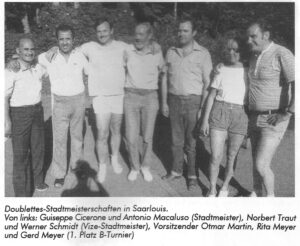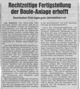 Das 2. Jahrzehnt 1976-1986 (Basierend auf dem Originaltext von Walter Engstler, aktualisiert von Stefan Wientjes)Ein Jahrzehnt des Wandels (ca. 1976–1986)Das zweite Jahrzehnt des Boule‑Club Saarlouis war geprägt von tiefgreifenden Veränderungen – sportlich, organisatorisch und kulturell. Die frühen Spielerinnen und Spieler der Gründungszeit traten zunehmend in den Hintergrund, während viele neue Mitglieder den Verein verjüngten und ihm ein frisches Gesicht gaben.Die Folge: Die Mitgliederzahlen stiegen deutlich, und nur wenige „alte Kämpfer“ blieben dauerhaft aktiv.Öffnung nach außen – Frankreich, Landesverband, BundesebeneDer Verein wagte in dieser Phase einen wichtigen Schritt: die konsequente Öffnung über die Stadt- und Landesgrenzen hinaus.Partnerschaft nach FrankreichEin intensiver Austausch begann mit den Boulefreunden aus Creutzwald, wodurch erstmals regelmäßige internationale Vereinskontakte entstanden.Vom Freizeittreff zum sportlich orientierten VereinMit der neuen Ausrichtung verschob sich der Schwerpunkt vieler Spieler zunehmend vom geselligen Beisammensein hin zum sportlichen Wettkampf.Dies führte einerseits zu einem deutlich höheren Spielniveau – mit Erfolgen auf Landes‑, Bundes‑ und internationaler Ebene –, andererseits aber auch dazu, dass der einst rege besuchte Bouleplatz am Sonntag zunehmend leer blieb.Der neue Bouleplatz im Stadtgarten (1979)Ein entscheidender Meilenstein war 1979 die Fertigstellung eines neuen Bouleplatzes nur wenige Meter vom „alten Katerturm“-Gelände entfernt:Großzügige AnlageFlutlichtEigenes ClubhausEinbindung in den StadtgartenDiese Anlage entwickelte sich zu einem der schönsten und beliebtesten Bouleplätze Deutschlands. Die Wege des Stadtgartens boten unbegrenzte Spielvarianten auf unterschiedlichstem Terrain – ideal für Turniere jeder Größe. Am 12. April 1979 berichtete die Saarbrücker Zeitung über ein bedeutendes Vorhaben im Stadtgarten Saarlouis. Im Zusammenhang mit der geplanten Neugestaltung des Restaurants Katerturm beschloss der Finanz‑ und Bauausschuss der Stadt Saarlouis auch den Neubau der bereits vorhandenen Bouleanlage des BC Saarlouis.Das Projekt sah die Errichtung von fünf Spielbahnen mit jeweils vier Metern Breite und 15 Metern Länge vor. Um Boulespiele auch in den späten Abendstunden zu ermöglichen, war zudem der Bau einer Flutlichtanlage mit zwei leistungsstarken Flutlichtmasten vorgesehen.Der vollständig erhalten gebliebene Baumbestand des Stadtgartens, ergänzt durch neu geplante Grünanlagen, sollte den Bodenbelag der Sportanlage einrahmen und den Sportlern insbesondere in den Sommermonaten eine naturnahe und zugleich moderne Spielstätte bieten – eine Anlage, die allen Anforderungen des zeitgemäßen Boulesports gerecht werden sollte.Zum Zeitpunkt des Berichts war die Sportanlage – mit Ausnahme der abschließenden Deckschicht, der Beleuchtungsanlage und der Grünflächen – bereits fertiggestellt. Ein Verbindungsweg zum Katerturm diente künftig als Zufahrt, während der alte Bouleplatz zu einem Parkplatz ausgebaut werden sollte.Aufgrund des langen Winters mussten die Bauarbeiten allerdings für rund drei Monate unterbrochen werden. Die Gesamtkosten des Projekts, einschließlich der Parkwege, wurden auf rund 75.000 Deutsche Mark geschätzt.1980 war es dann soweit: Das traditionelle 1.-Mai-Turnier begann mit einem ganz besonderen Ereignis. Im Rahmen des Turniers wurde das neue Clubheim des Boule Club Saarlouis feierlich eingeweiht. Die Stadt Saarlouis hatte das Clubhaus ein Jahr zuvor im Stadtgarten für den Verein eingerichtet.Oberbürgermeister Dr. Manfred Henrich übergab das neue Clubheim im Rahmen einer offiziellen Feierstunde symbolisch an die Mitglieder des Boule Clubs Saarlouis und setzte damit ein wichtiges Zeichen der Anerkennung für die Vereinsarbeit.Starke Jugend – ein Glücksfall für den VereinBesonders positiv wirkte sich die große Zahl spielbegeisterter Jugendlicher aus, die in diesen Jahren zum Verein stießen. Ihre behutsame Förderung und erfolgreiche Integration in den Spielbetrieb brachte mehrere herausragende Spielerpersönlichkeiten hervor. Bemerkenswert: Alle Jugendlichen waren Kinder aktiver Vereinsmitglieder. Turnierkultur und VereinslebenIn diesem Jahrzehnt entstand eine reiche Turnier- und Veranstaltungstradition, die den Jahreslauf prägte:WinterturnierHasenturnierClubmeisterschaftenKirmesturnierJahresabschlussfestZudem pflegte der Verein Kontakte nach Marmoutier (Elsass), Mitry‑Mory (bei Paris) und Aubonge (Belgien).Auch die Stadtmeisterschaften und das 1.-Mai-Turnier etablierten sich als feste Größen – mit Teilnehmenden aus Belgien, Luxemburg und vor allem aus Lothringen.Darüber hinaus richtete der BC 66 zahlreiche Saarlandmeisterschaften und Pokalturniere aus und erarbeitete sich den Ruf hoher Zuverlässigkeit und Organisation.Höhepunkte des JahrzehntsZu den besonderen Ereignissen dieser Zeit zählte unter anderem der offizielle Concours de Pétanque der französischen Fédération im Jahr 1977 – ein starkes Zeichen der Anerkennung über die Landesgrenzen hinweg.1979 – Die Geburtsstunde des Saarländischen Boule‑Verbands (SBV)Ein besonders historisches Jahr war 1979, als sich auf Initiative des BC 1966 Saarlouis sechs Vereine in Völklingen trafen, um den Saarländischen Boule‑Verband (SBV) zu gründen.Gründungsvereine SBVSaarlouisSaarwellingenSaarbrücken Nanteser PlatzDillingenVölklingenNalbachWie bedeutend dieser Schritt war, zeigt ein Blick auf die Entwicklung:1979: 6 Vereine1996: bereits 52 Vereine2026: 60 Vereine mit 1.700 MitgliedernDer BC 1966 Saarlouis stellte mit Walter Engstler zudem den ersten und langjährigen Präsidenten des neuen Landesverbands. 1983 Die erste saarländische Lizenz der F.I.P.J.P mit der Nr. 001Landesverband und neue TurnierlandschaftMit der Gründung des Landesverbandes nahm der BC Saarlouis verstärkt an Turnieren auf Landesebene teil und richtete selbst große Turniere aus – e